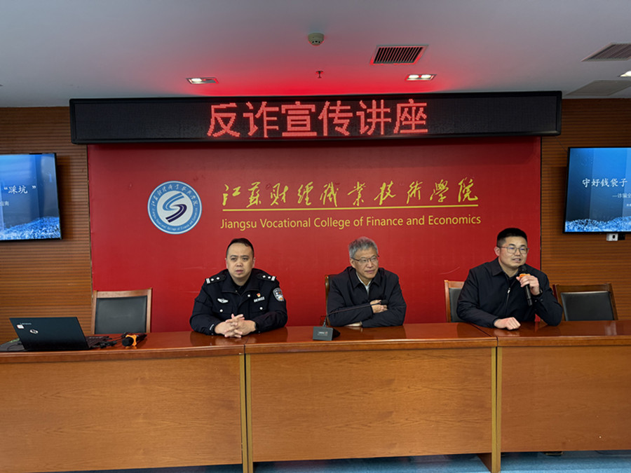 3月4日下午,学校邀请枚乘路派出所副所长、大学城中心警务室主任周建兵、民警王欢在图书馆学术报告厅开展2026年春季开学反诈宣传讲座。党委委员、副校长梁枫现场指导并讲话。校院两级大学生安全教育实践部全体成员、各班级治保委员及部分学生代表等200余人参加。本次活动由保卫处处长陈伟辉主持。